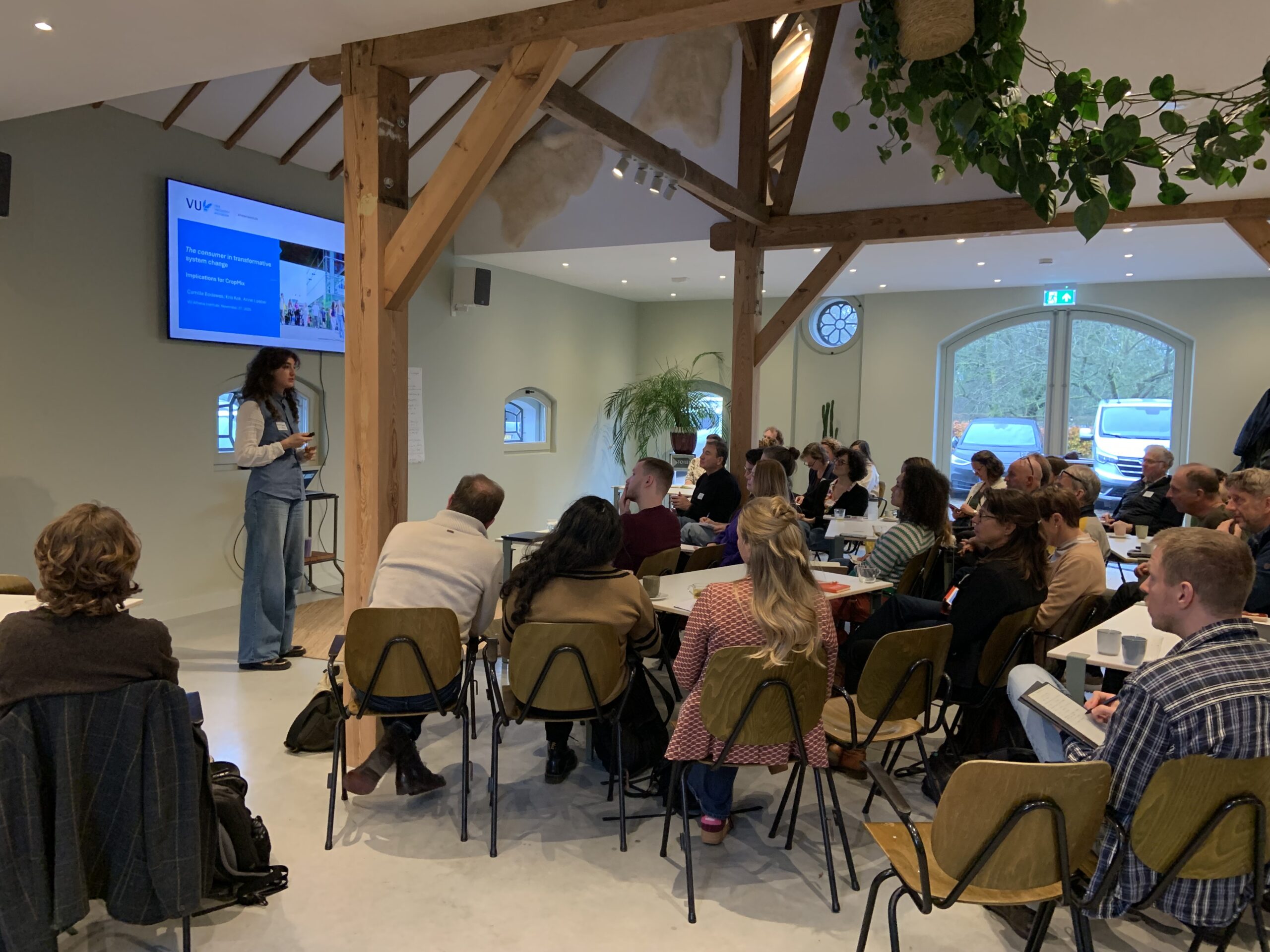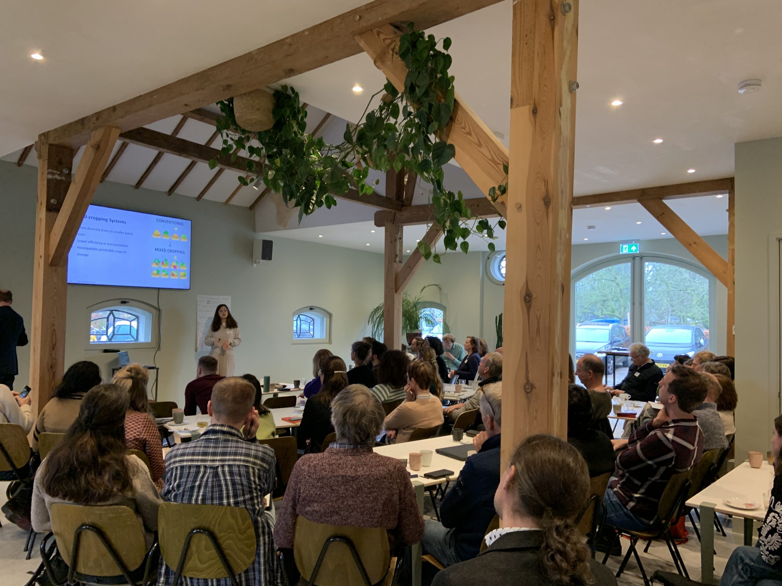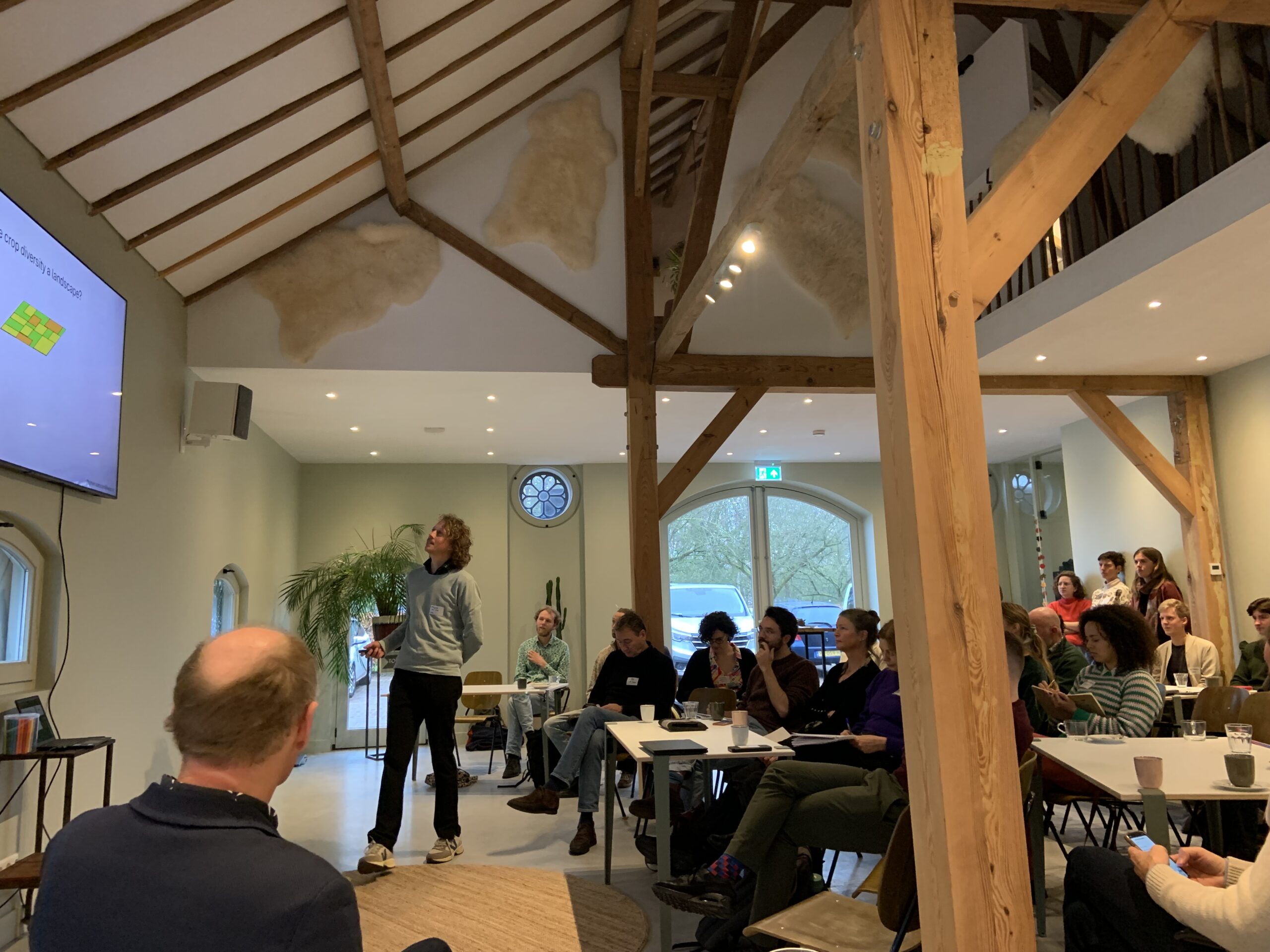 Dit gesprek volgde mooi op de reeks met resultaten die onze PhD-kandidaten in de ochtend presenteerden. Rik Waenink liet resultaten zien over insectenbiodiversiteit en vogels in strokenteelt, Thijmen van Loon praatte ons bij over hoe zijn wiskundige model kan helpen bij het maken van keuzes om de biodiversiteit in een landschap te optimaliseren. Franca Bongers presenteerde namens Ana Ferreira Ernst en Kostas Kypros hoe 3D-modellen van plantengroei kunnen helpen bij het optimaliseren van gewascombinaties. Daphne Schoop liet zien welke soorten ‘relationeel werk’ boeren moeten doen, zeker wanneer ze naar een nieuw teeltsysteem overstappen. Camilla Bodewes schetste een perspectief van hoe wij naar consumenten kijken en hoe dat beïnvloedt hoe verschillende actoren in het voedselsysteem handelen. Lisa Marijke van den Berg presenteerde haar eerste bevindingen over het ontwikkelen van nieuwe technologie voor gewasdiverse teeltsystemen en Tugce Canbilen Suticen presenteerde hoe zij met haar model kan voorspellen of de korte of lange keten geschikt is voor de afzet van strokenteeltproducten.
