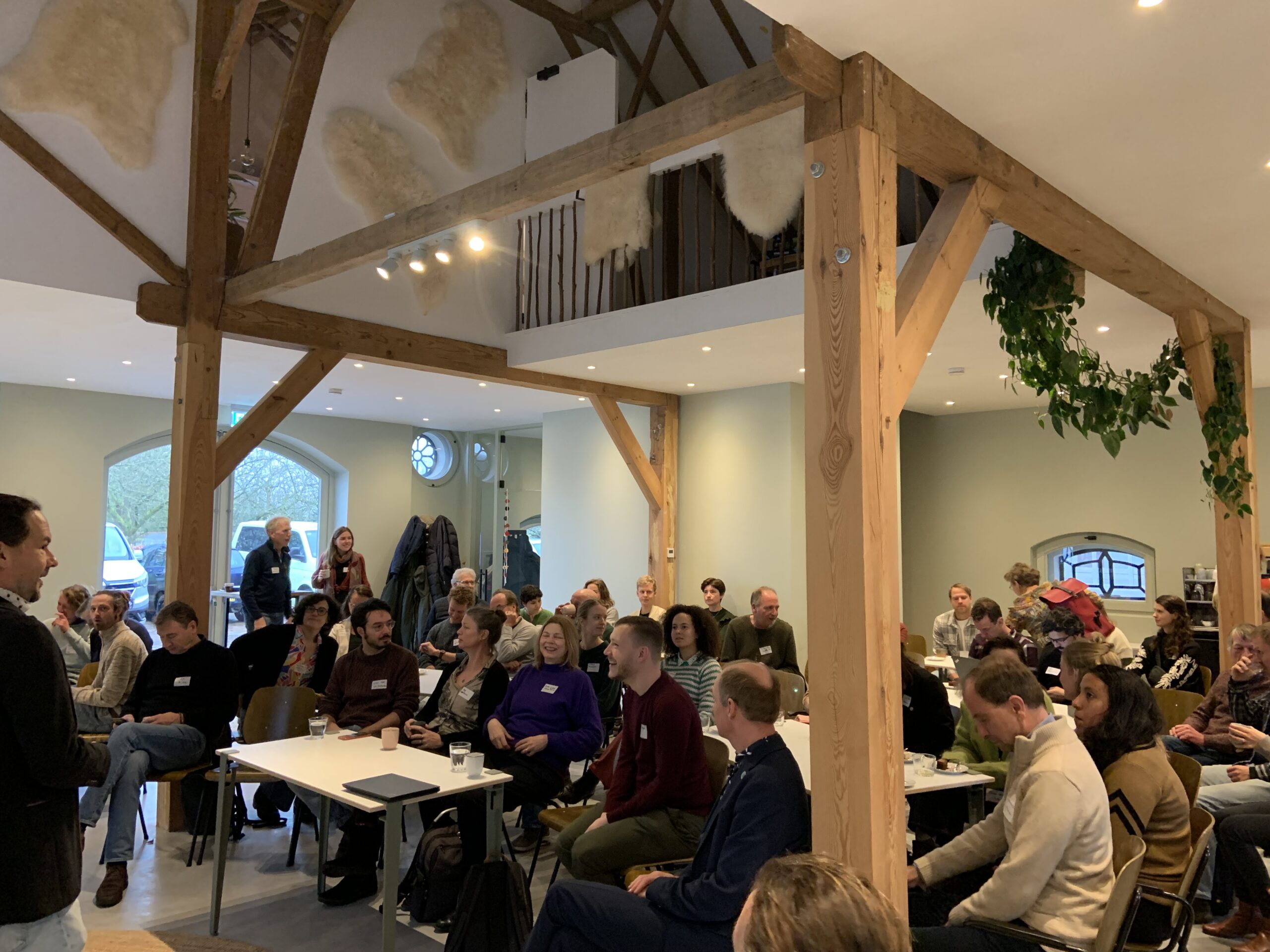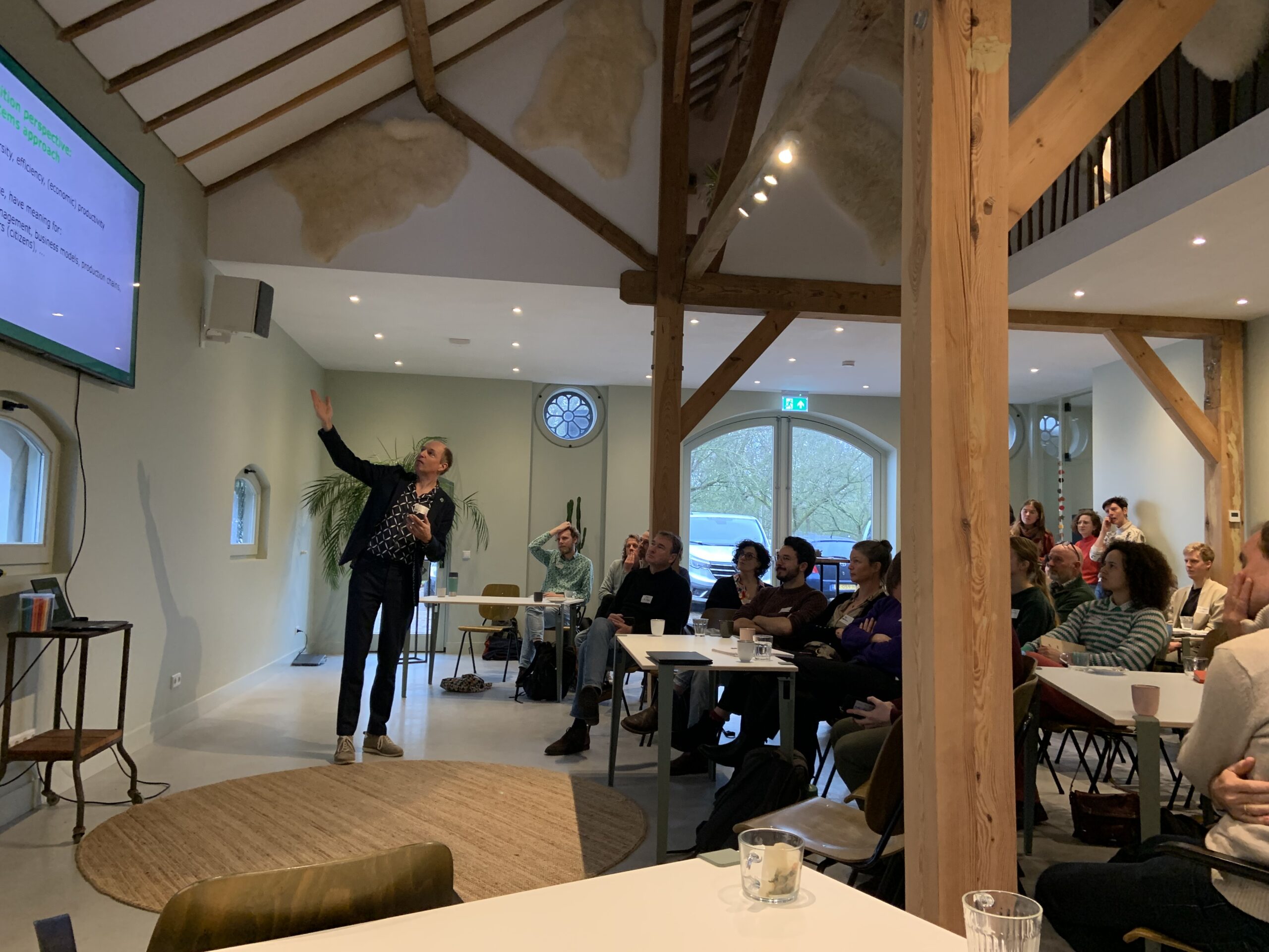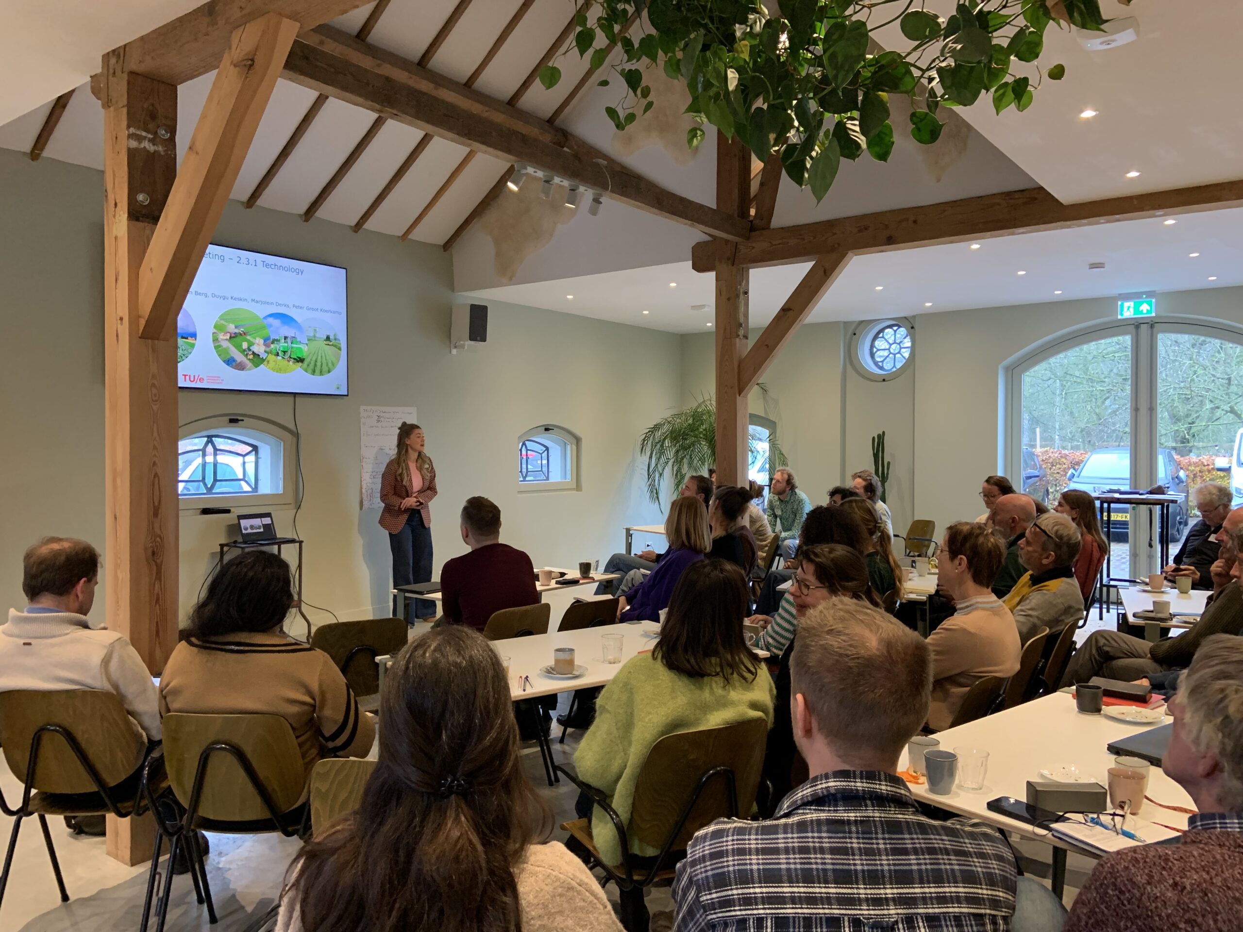 Dit gesprek volgde mooi op de reeks met resultaten die onze PhD-kandidaten in de ochtend presenteerden. Rik Waenink liet resultaten zien over insectenbiodiversiteit en vogels in strokenteelt, Thijmen van Loon praatte ons bij over hoe zijn wiskundige model kan helpen bij het maken van keuzes om de biodiversiteit in een landschap te optimaliseren. Franca Bongers presenteerde namens Ana Ferreira Ernst en Kostas Kypros hoe 3D-modellen van plantengroei kunnen helpen bij het optimaliseren van gewascombinaties. Daphne Schoop liet zien welke soorten ‘relationeel werk’ boeren moeten doen, zeker wanneer ze naar een nieuw teeltsysteem overstappen. Camilla Bodewes schetste een perspectief van hoe wij naar consumenten kijken en hoe dat beïnvloedt hoe verschillende actoren in het voedselsysteem handelen. Lisa Marijke van den Berg presenteerde haar eerste bevindingen over het ontwikkelen van nieuwe technologie voor gewasdiverse teeltsystemen en Tugce Canbilen Suticen presenteerde hoe zij met haar model kan voorspellen of de korte of lange keten geschikt is voor de afzet van strokenteeltproducten.