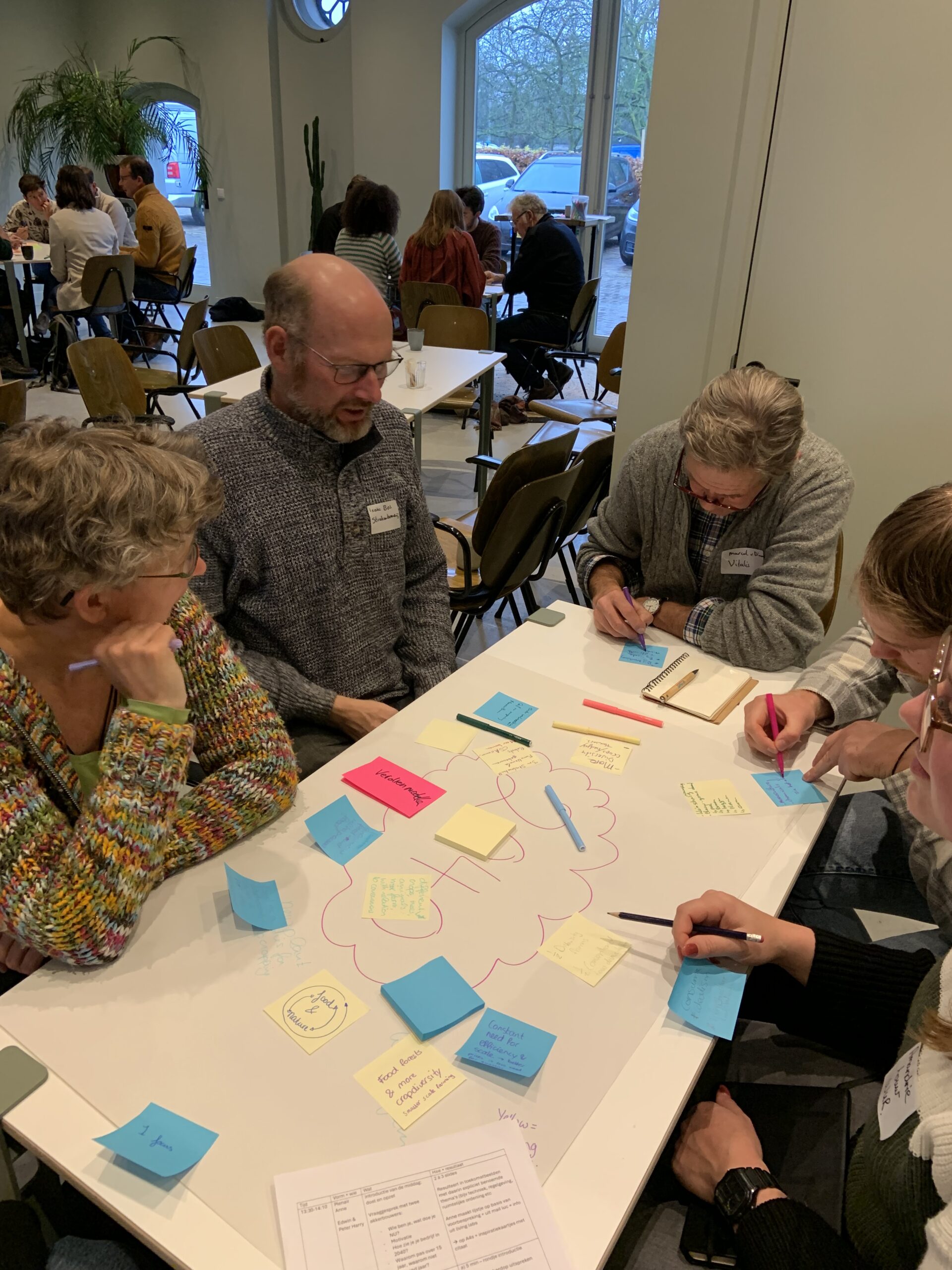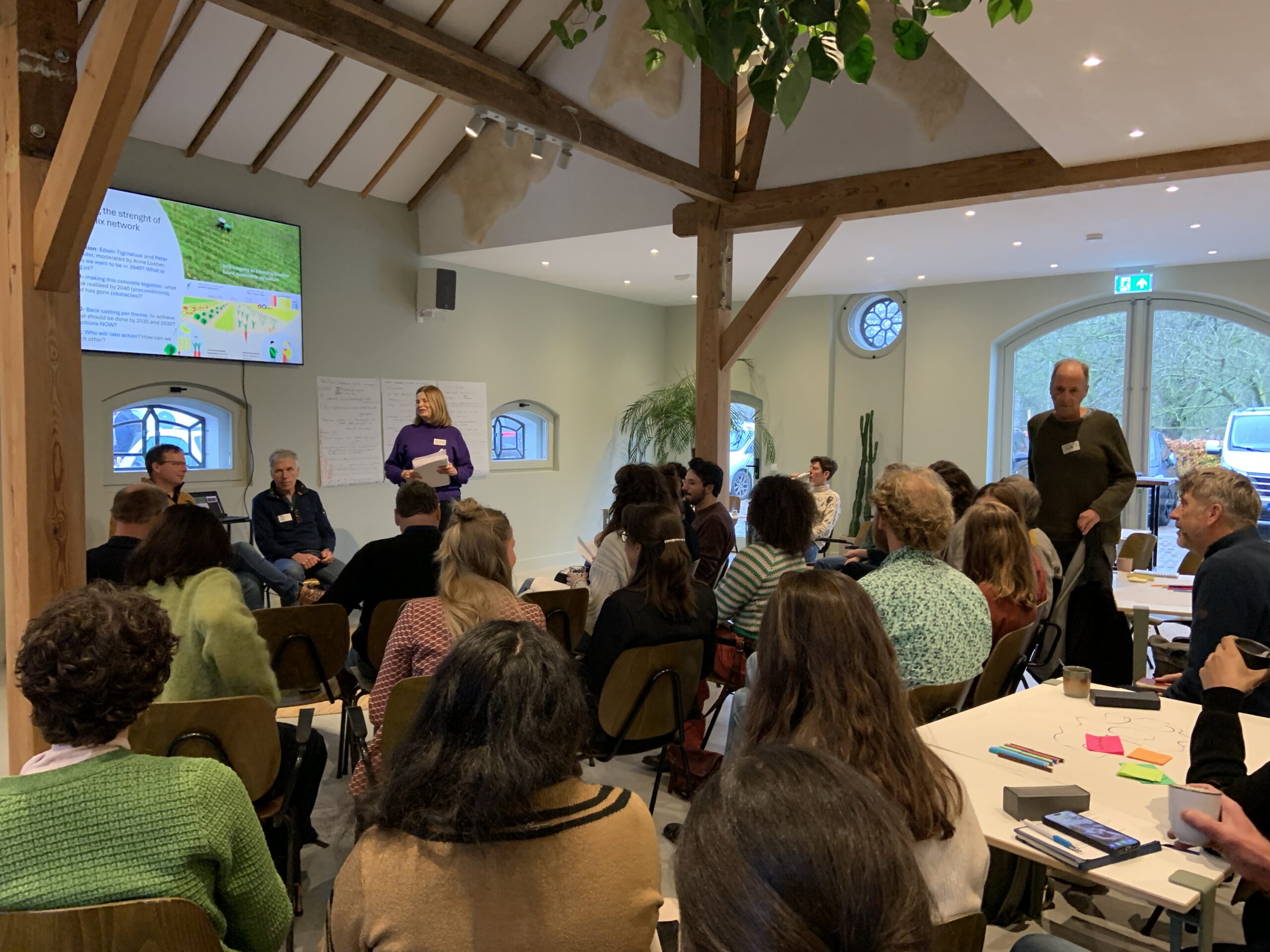 We vroegen het onze consortiumpartners tijdens de consortiumbijeenkomst op 27 november in Odijk. Na twee inspirerende toekomstbeelden van akkerbouwers Peter Harry Mulder en Edwin Tigchelaar gingen we in groepjes aan de slag om een tijdlijn te maken. Wat moet er in 2035, 2030 en nu gebeuren om dit toekomstbeeld te realiseren? Daar kwamen thema’s voorbij als – natuurlijk – gewasdiversiteit, afwisselend landschap, maar ook verdienmodellen, beleid en regelgeving en zaken als benodigde cultuurverandering en onderwijs van toekomstige boeren en consumenten. Iedereen ging naar huis met een actiepunt.
